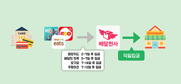 배달의 민족, 요기요, 쿠팡잇츠 매출 선결재 익일 입금 -